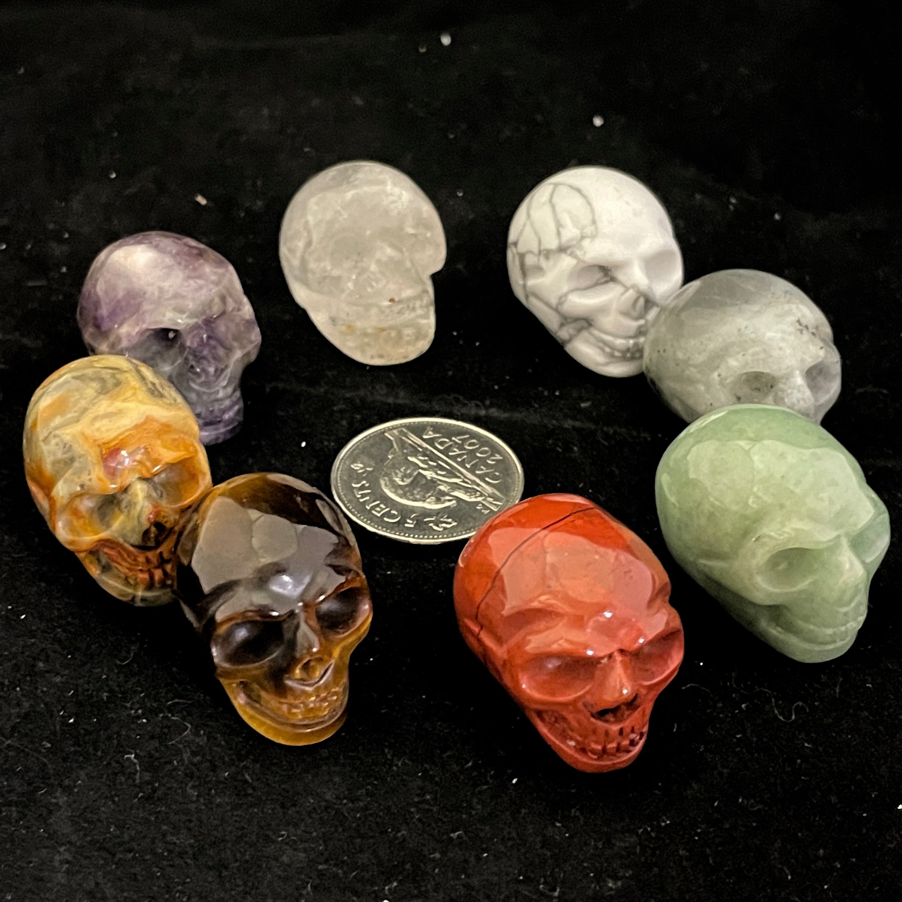 Skulls roughly 1" in size, carved in a variety of beautiful crystals. A perfect item for an altar or sacred space, or for carrying in a mojo bag.
